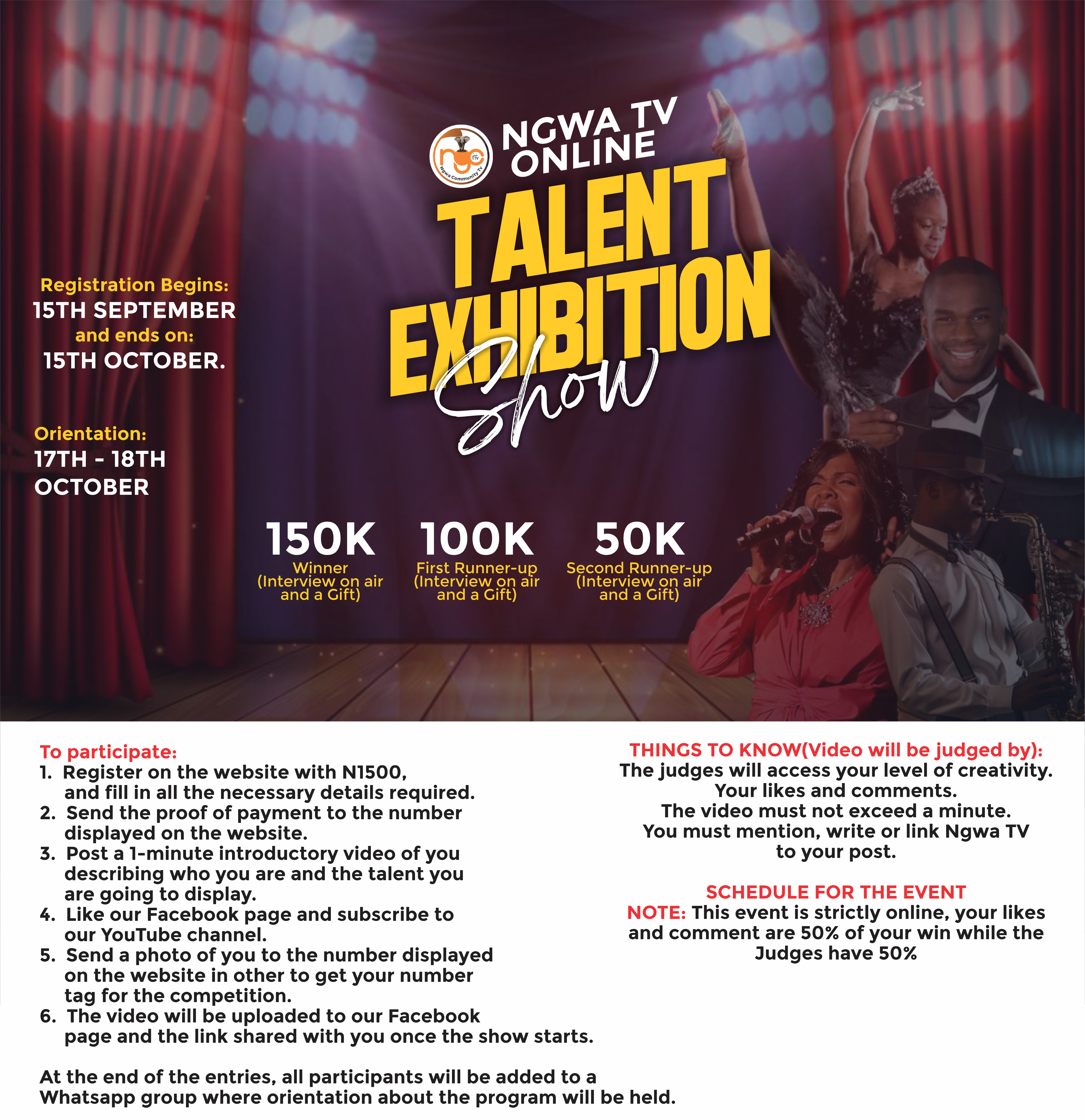 NgwaTv online Talent Hunt is an exhibition organized to discover and showcase amazing talents in Ngwa land . We are looking out for the next set of Global Superstars. Participation is open to all. Come showcase your talent"Ngwa